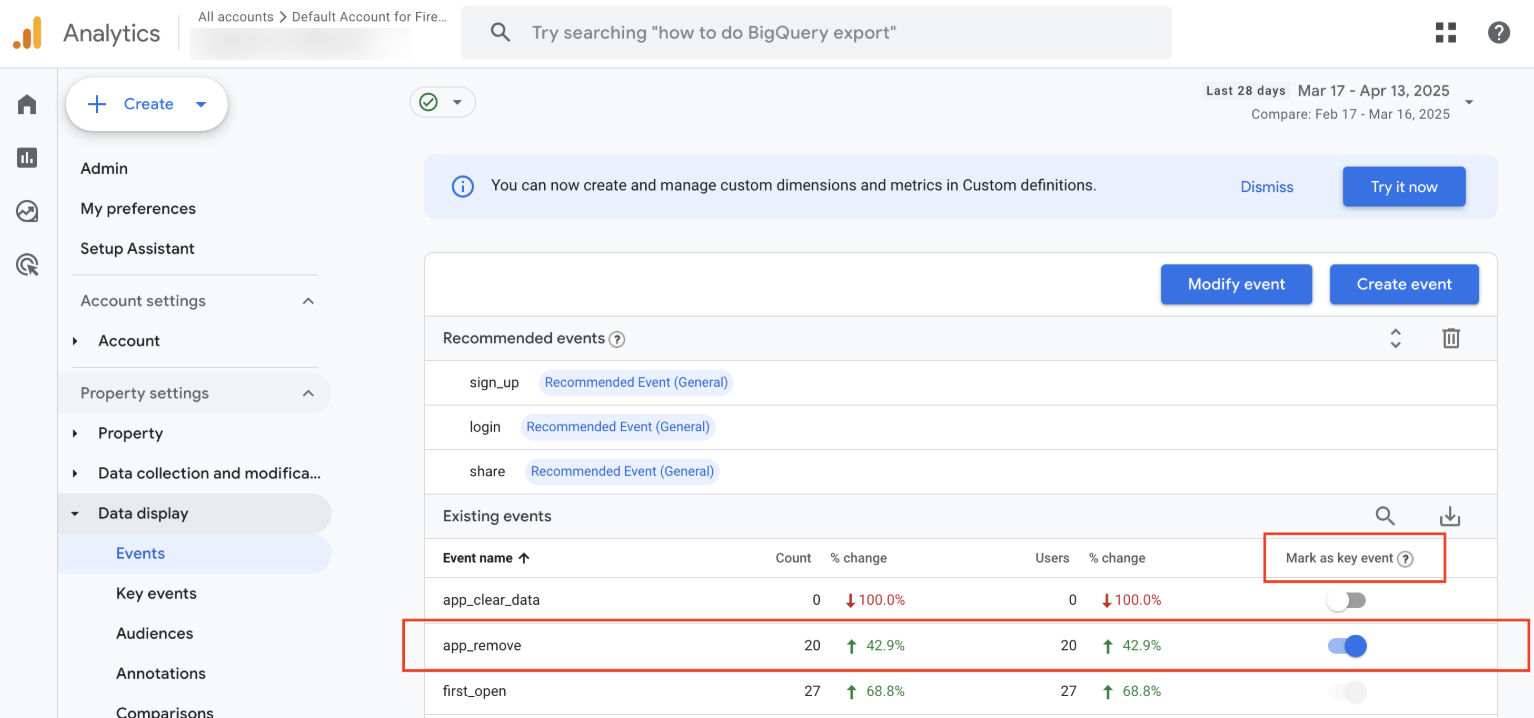 app_remove as Key Event in Google AnalyticsTo set up real-time uninstalls, ensure that a Key Event is configured for the app_remove event in the GA4 dashboard. The app_remove event is automatically logged by Firebase Analytics. It is triggered when an Android app is uninstalled from a device, regardless of the installation source. This event is available only for Android devices.
